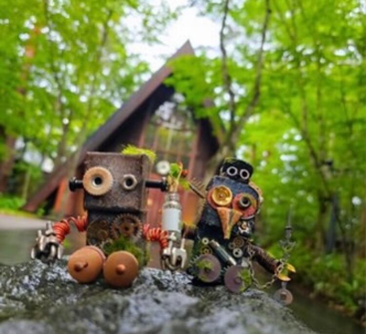 デニムのボディーにギアやネジなどで装飾し、サビ加工と苔加工を施したロボットくんです。