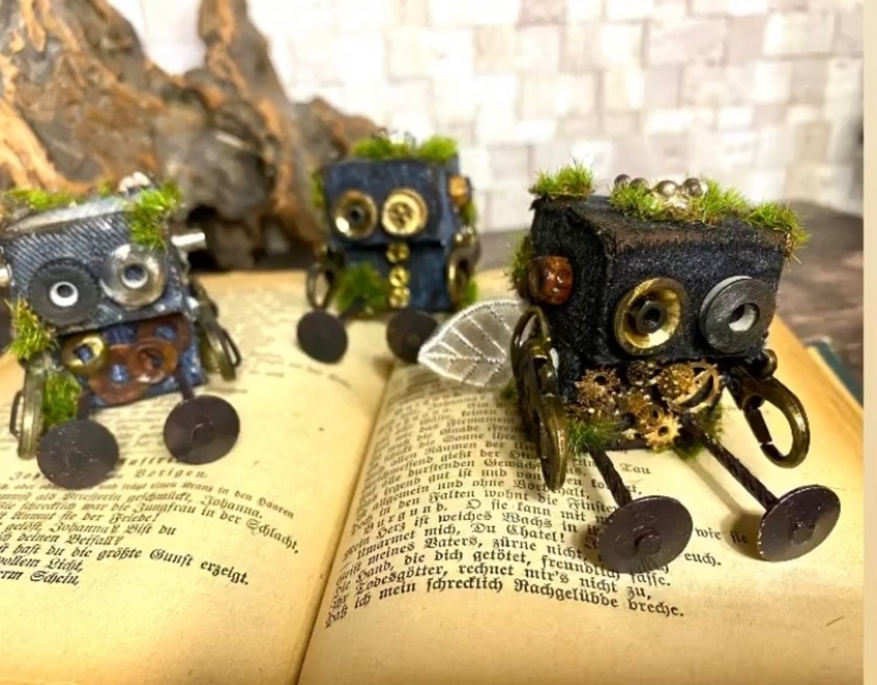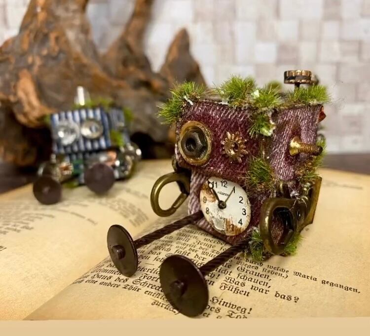 デニムのボディーにギアやネジなどで装飾し、サビ加工と苔加工を施したロボットくんです。
