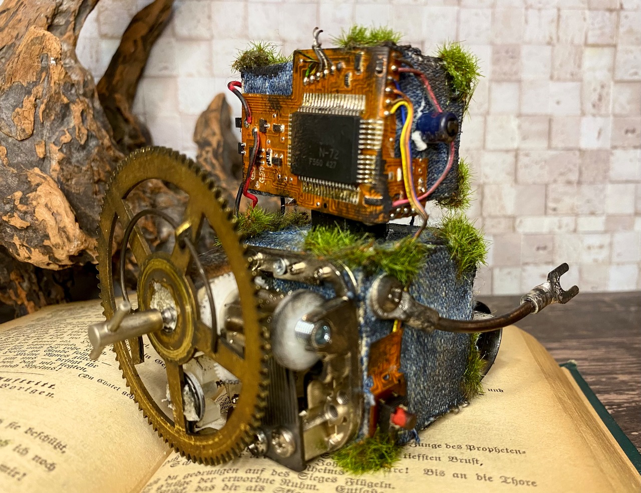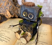 デニムのボディーにギアやネジなどで装飾し、サビ加工と苔加工を施したロボットくんです。